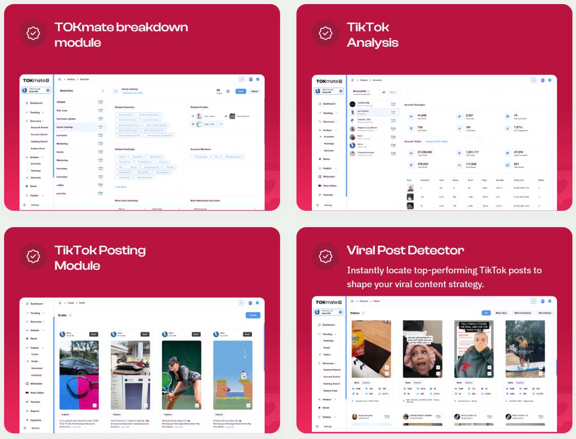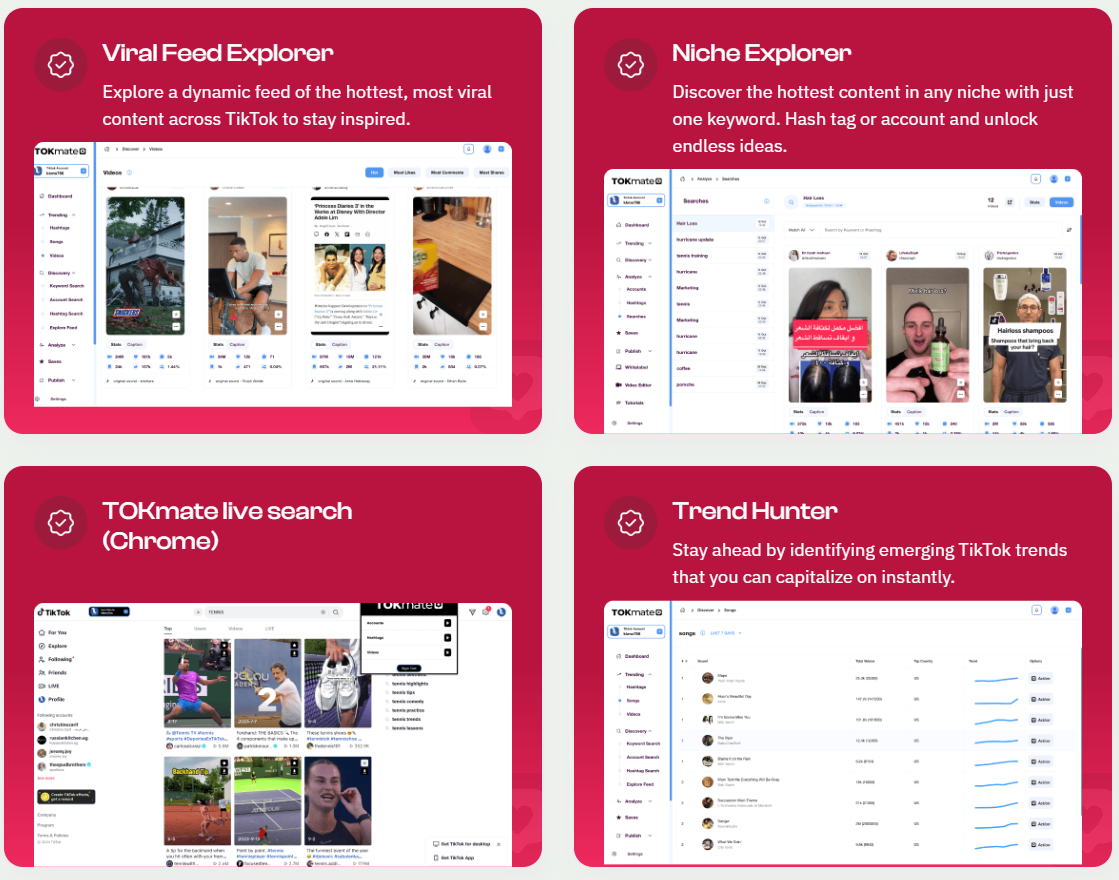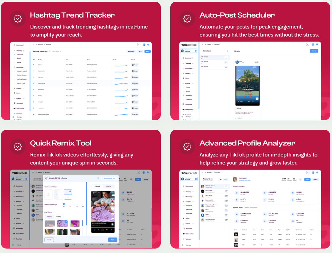 A9: TOKmate stands out due to its comprehensive approach to automating viral success on TikTok. Unlike other tools, it not only schedules posts but also discovers viral content and provides detailed insights into content trends and profile analysis, all without the need for creating original content.